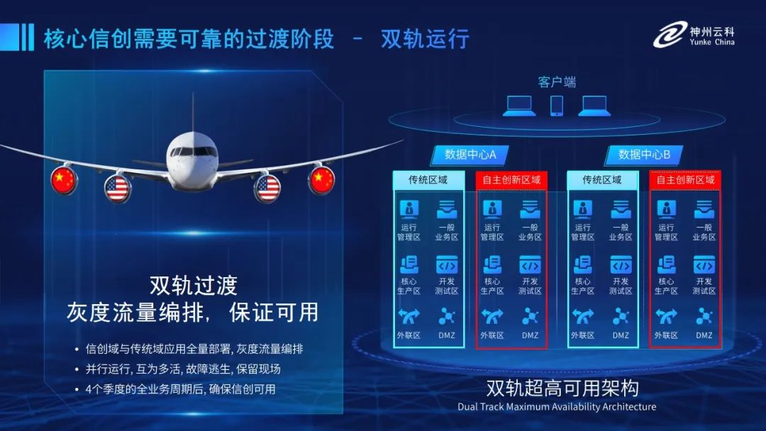 為幫助客戶更好地應對數字經濟時代對應用可持續(xù)性的高要求,實現信創(chuàng)與數字化兼得,leyu.樂魚推出了雙軌超高可用架構。雙軌超高可用架構在雙活數據中心的分區(qū)調度基礎上,增加信創(chuàng)域和非信創(chuàng)域的分域調度,實行信創(chuàng)域與傳統域應用全量部署,使雙中心運營變?yōu)殡p中心四區(qū)域并行運行,互為多活,將傳統架構變?yōu)榉謪^(qū)分域協同的多活雙軌超高可用架構。幫助客戶在新架構下,保障“信創(chuàng)”的同時解決性能瓶頸,提升穩(wěn)定性,保證應用可持續(xù)性,最終實現信創(chuàng)區(qū)域和非信創(chuàng)區(qū)域的平滑過渡,完成國產化替代目標?!?/p>